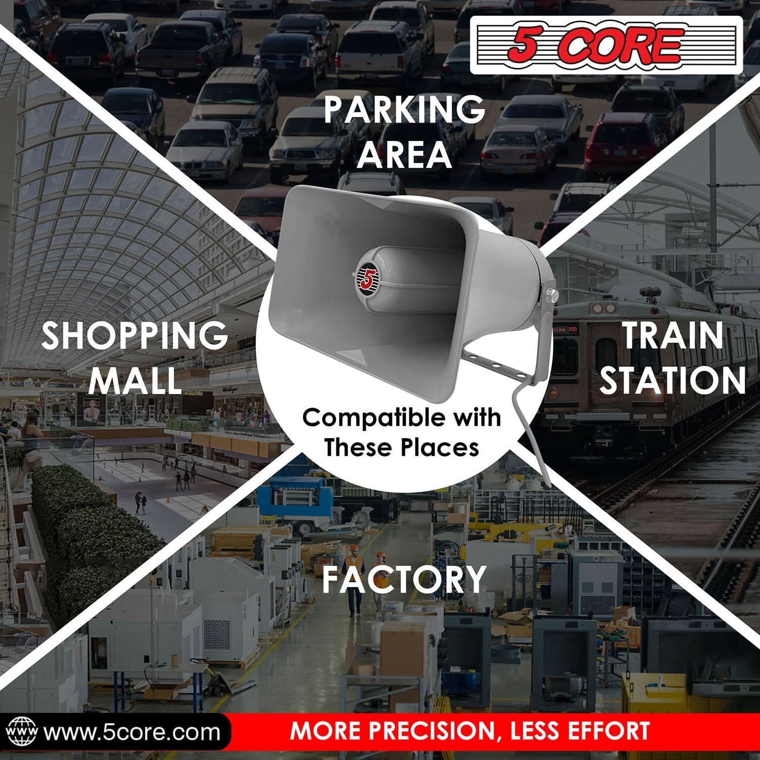 Deliver clear audio across far distances with the loud PA horn, featuring 100W peak and 20W RMS power. Built with a heavy duty ABS structure, this all-weather loudspeaker can withstand severe climates, making it ideal for outdoor use. The outdoor pa systems' great frequency response of 400 Hz–5 KHz ensures speech and music are easily understood. Compatible with most amplifiers, receivers, and audio equipment, thanks to its 8 Ohm impedance, this bocinas de voz para carro integrates seamlessly into your setup. The adjustable bracket allows for flexible positioning, ensuring the perfect fit for your needs. Improve your outdoor announcement with unmatched clarity and durability with 5 Core PA Horn. |