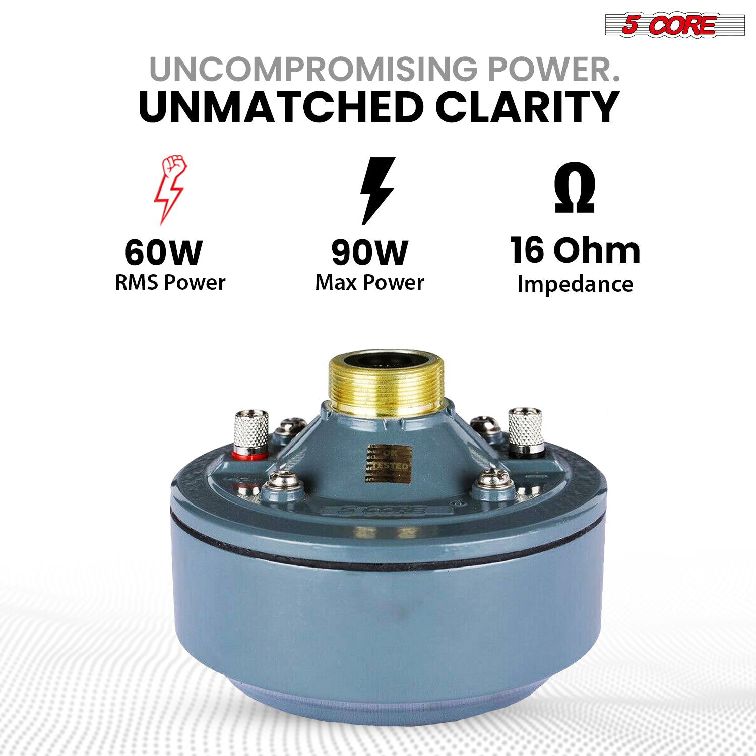 Experience unmatched audio clarity with our compression driver, delivering a powerful 60-watt RMS output and an impressive 600-watt PMPO. With a broad frequency response of 160-7000 Hz and a 16-ohm impedance rating, this tweeter ensures dynamic sound reproduction. Constructed from durable aluminum and featuring a robust Y 30 Ferrite Magnet, it's built to last. Perfect for outdoor applications, the exit phenolic driver boasts weatherproof capabilities and universal 18 T.P.I threading for easy installation. Weighing just 4.5 lbs, it offers a lightweight yet potent solution for enhancing your audio setup. Elevate your sound experience today with our superior horn Driver Tweeter. |