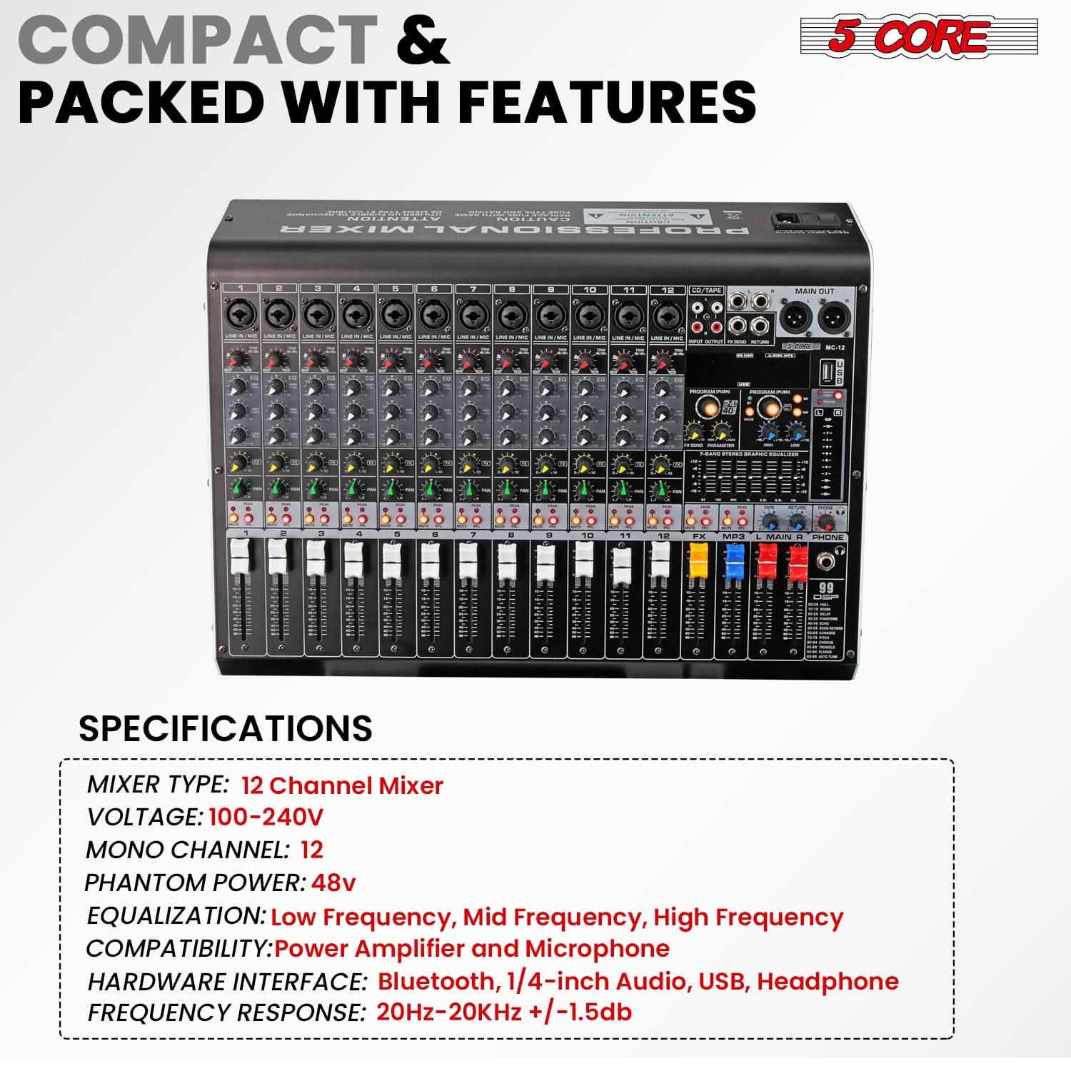 5 Core Audio Mixer 12 Channel DJ Equipment with Bluetooth USB Console Sound Board