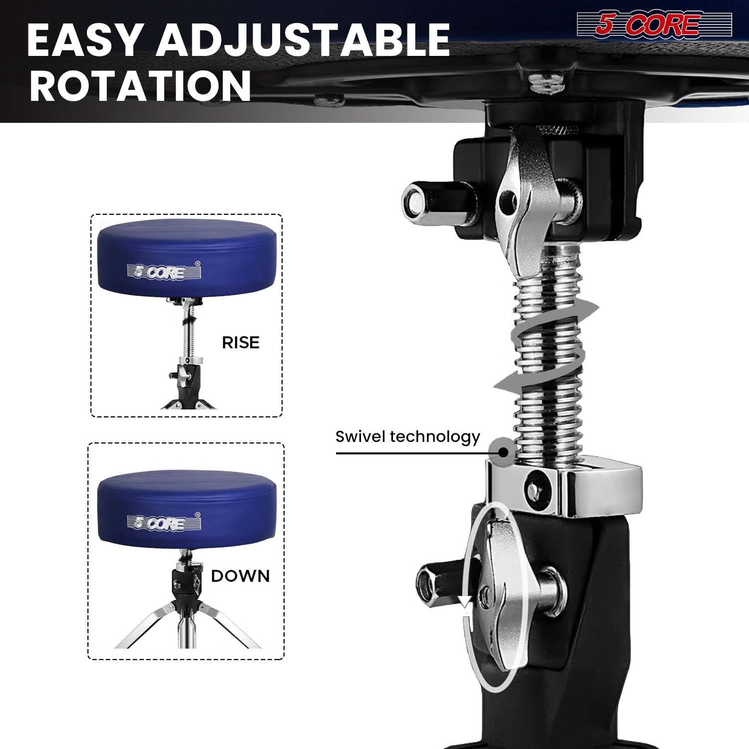 The 360° rotating seat allows drummers to move freely without adjusting the stool position, providing smooth performance and flexibility. |