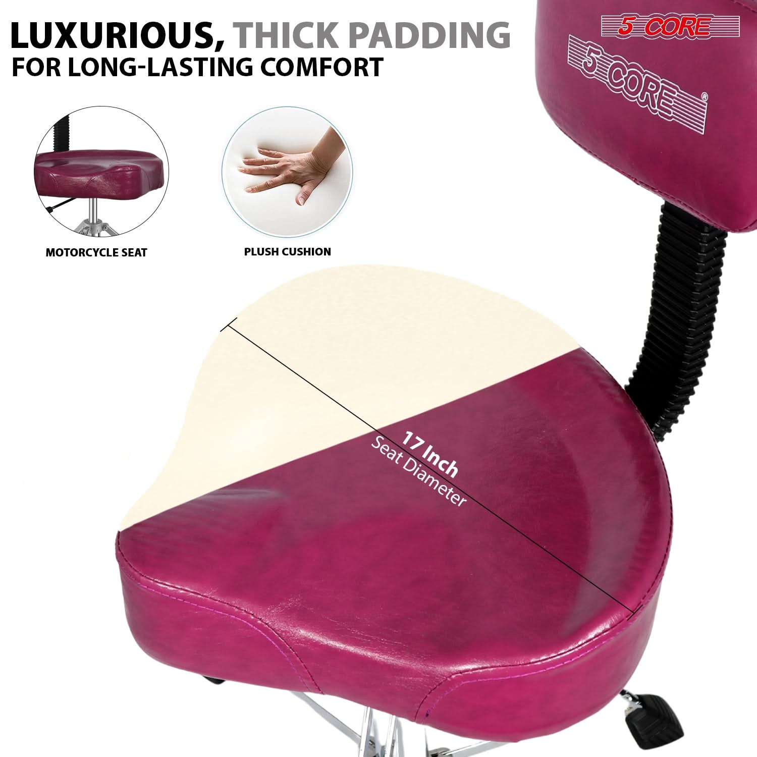【Ergonomic & Comfortable Drum Throne】 Enjoy long jam sessions with this 4” thick high-density foam seat, designed for superior comfort and support. The 17 x 15” saddle-shaped drum seat evenly distributes weight, reducing tailbone pressure and ensuring a fatigue-free performance. Perfect as a drum throne, drum seat, or musician stool.