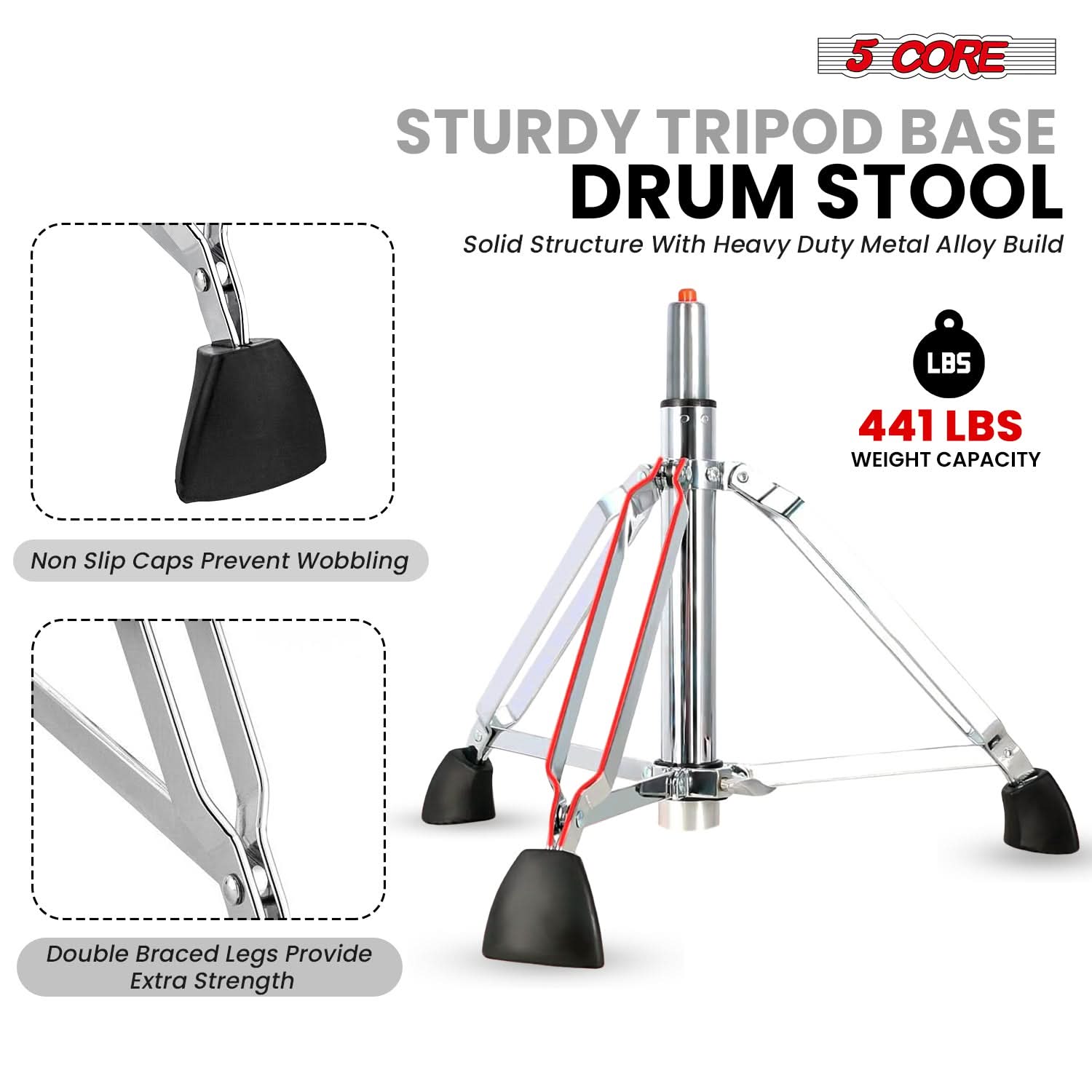 【Heavy-Duty Build & Stability】Built with robust double-braced steel legs and anti-slip rubber feet, this stool ensures excellent balance and prevents sliding during energetic performances. Supports up to 441 lbs with no wobble or tip-over risk.