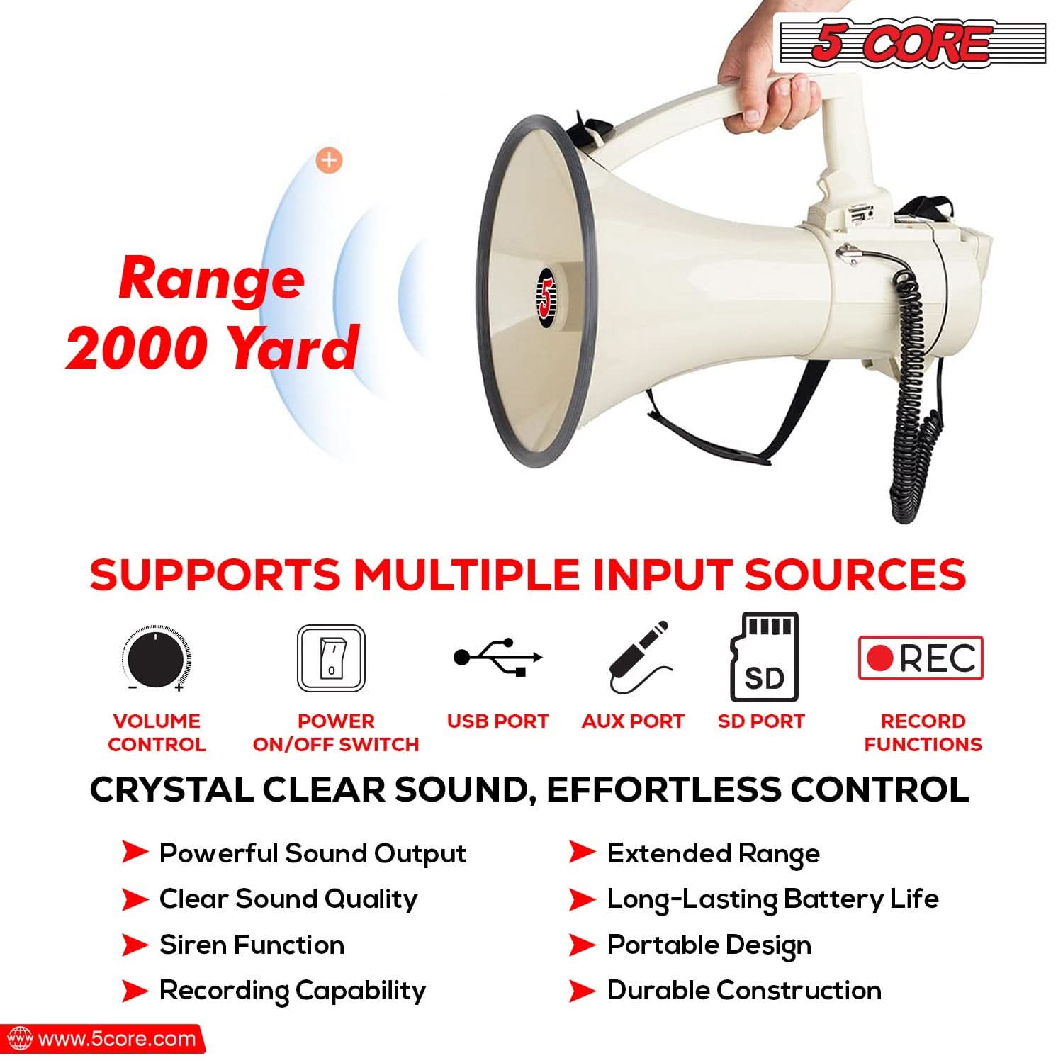 5 Core Megaphone 100W Bull Horn Professional PA Speaker w 2000 Yards Range Loud Siren Voice Amp