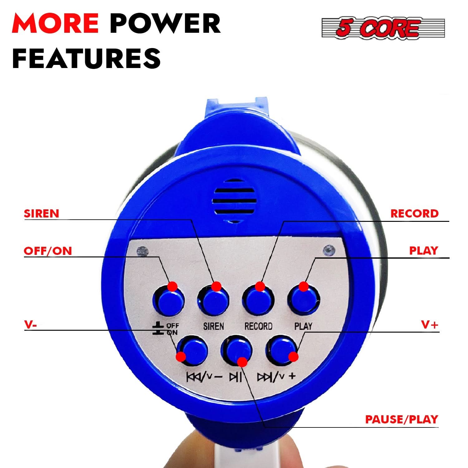 5 Core professional loud megaphone, designed to make your voice heard with clarity and precision! Delivers a robust 30W of power, ensuring your message carries across any crowd. Easily adjust the volume to suit your needs and record up to 8 seconds of your speech for repeated playback. Activate the alarm/siren mode for emergencies or attention grabbing situations. The built-in mic in the portable loud blowhorn offers versatility in sound projection. With an impressive 800 yard voice projection range, powered by 4 type “D” batteries (included), this powerful mega phone is your ultimate communication tool for any event or occasion. |