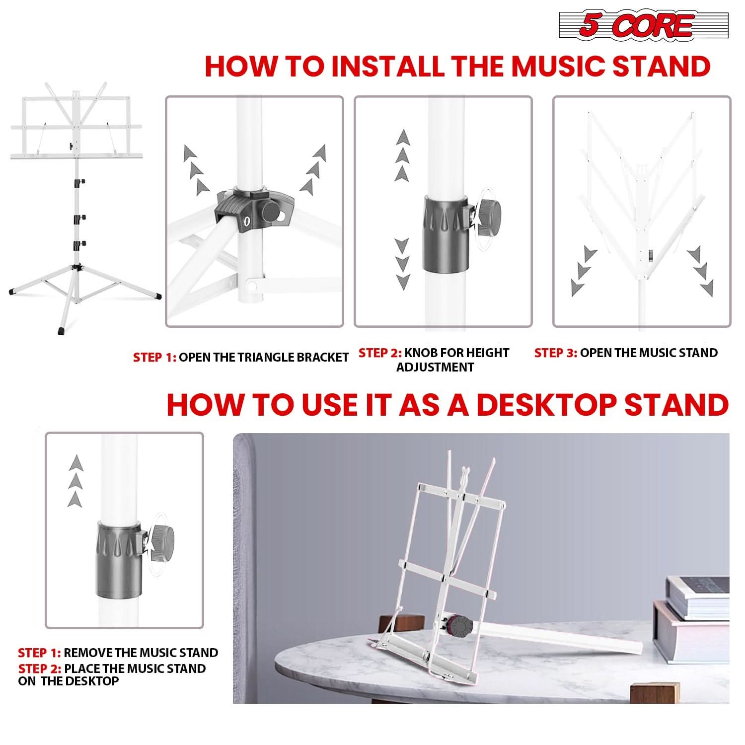 5Core Music Stand For Sheet Music Portable Tripod MUS FLD 4S WH
