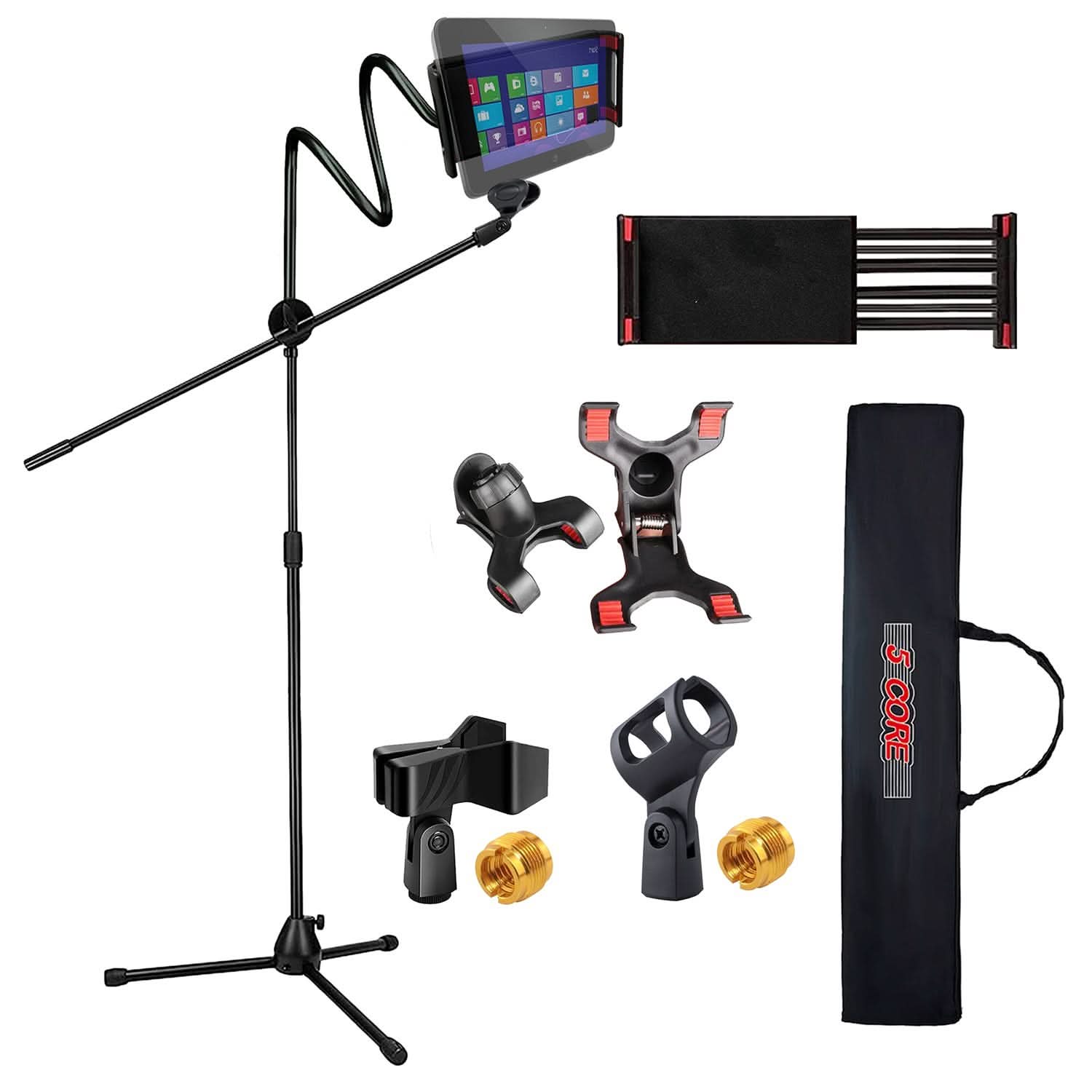 5 Core mic stand with phone and tablet holder, designed for maximum convenience and versatility. The clamp-style phone holder support most smartphones. The tablet holder is adjustable and can accommodate devices up to 6.9 inches. With a height range of 44 to 67 inches, this tripod mic stand floor suits any setup. Made from metal with anti-corrosion paint, it ensures reliable use for long time. Anti-slip rubber caps offer superior stability on any surface, protecting your floors. Enjoy flexible adjustments with a 360-degree gooseneck rotation, extendable boom arm, and adjustable mic holder. The tripod microphone stand has a foldable design and comes with a premium bag, making it easy to portable and store. Whether you're a musician, content creator, or speaker, this boom mic stand provides functionality and practicality for all your needs.
