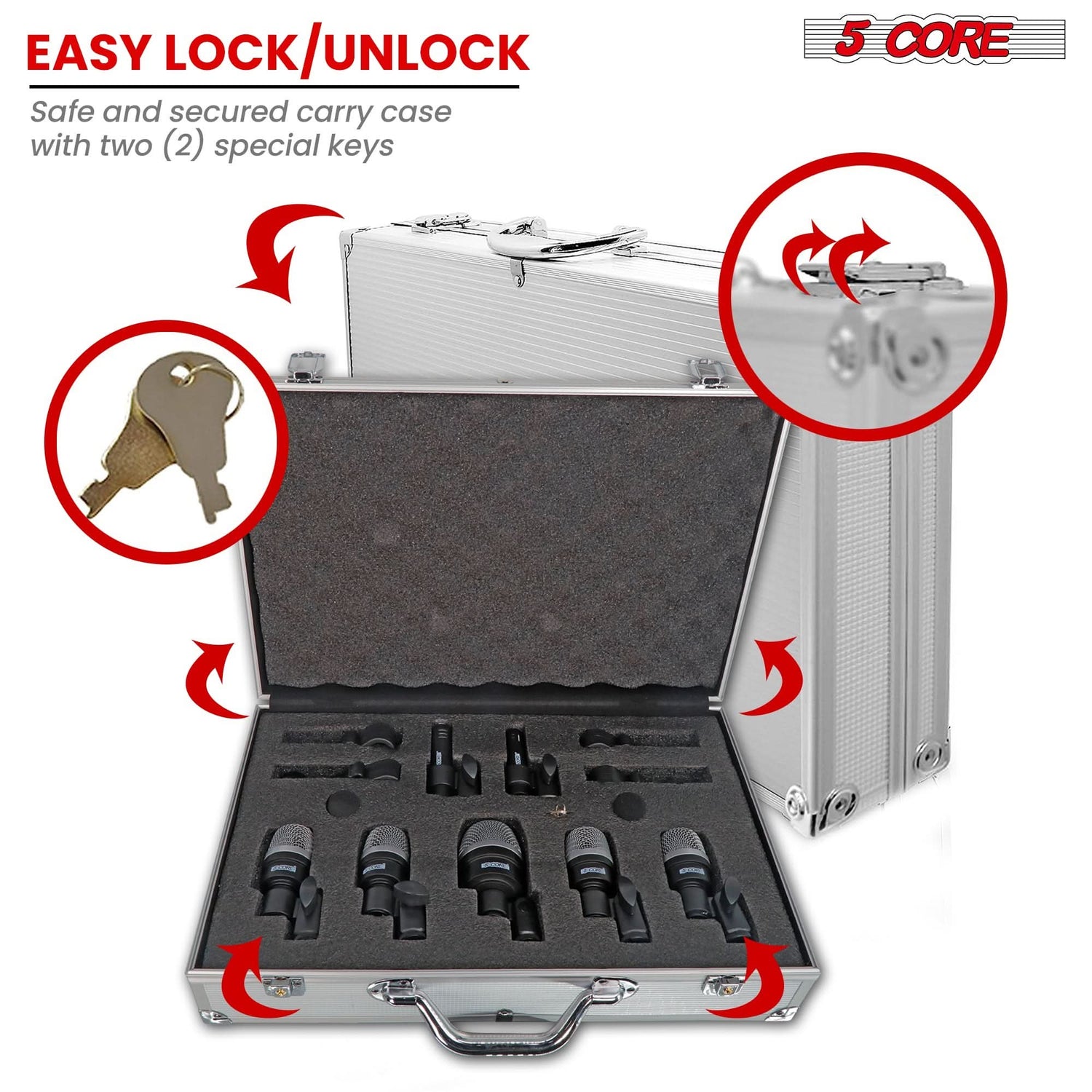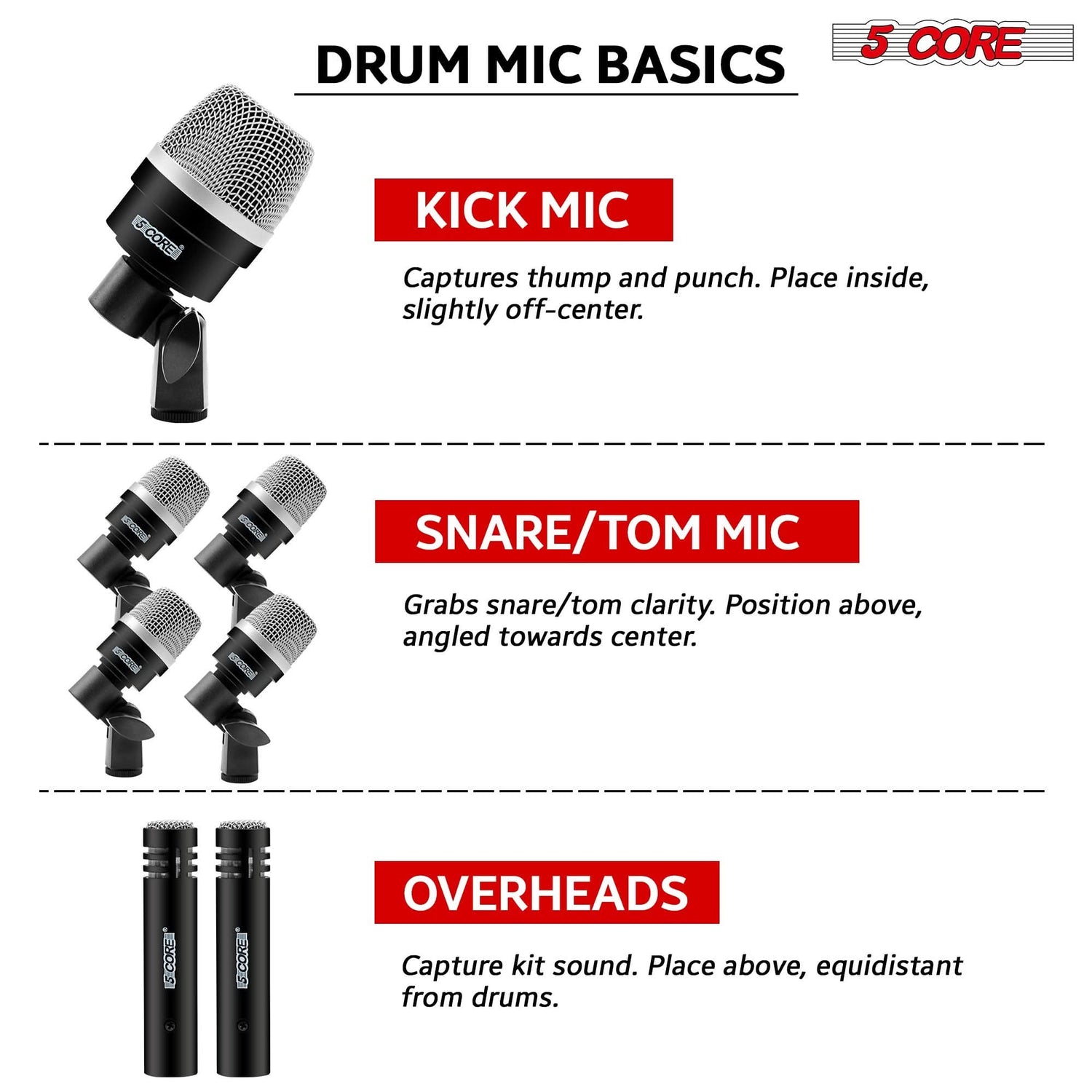 5Core Drum Mic Kit 7 Pcs Kick BassTom Snare Dynamic Microphone Instrument Mics Set Black