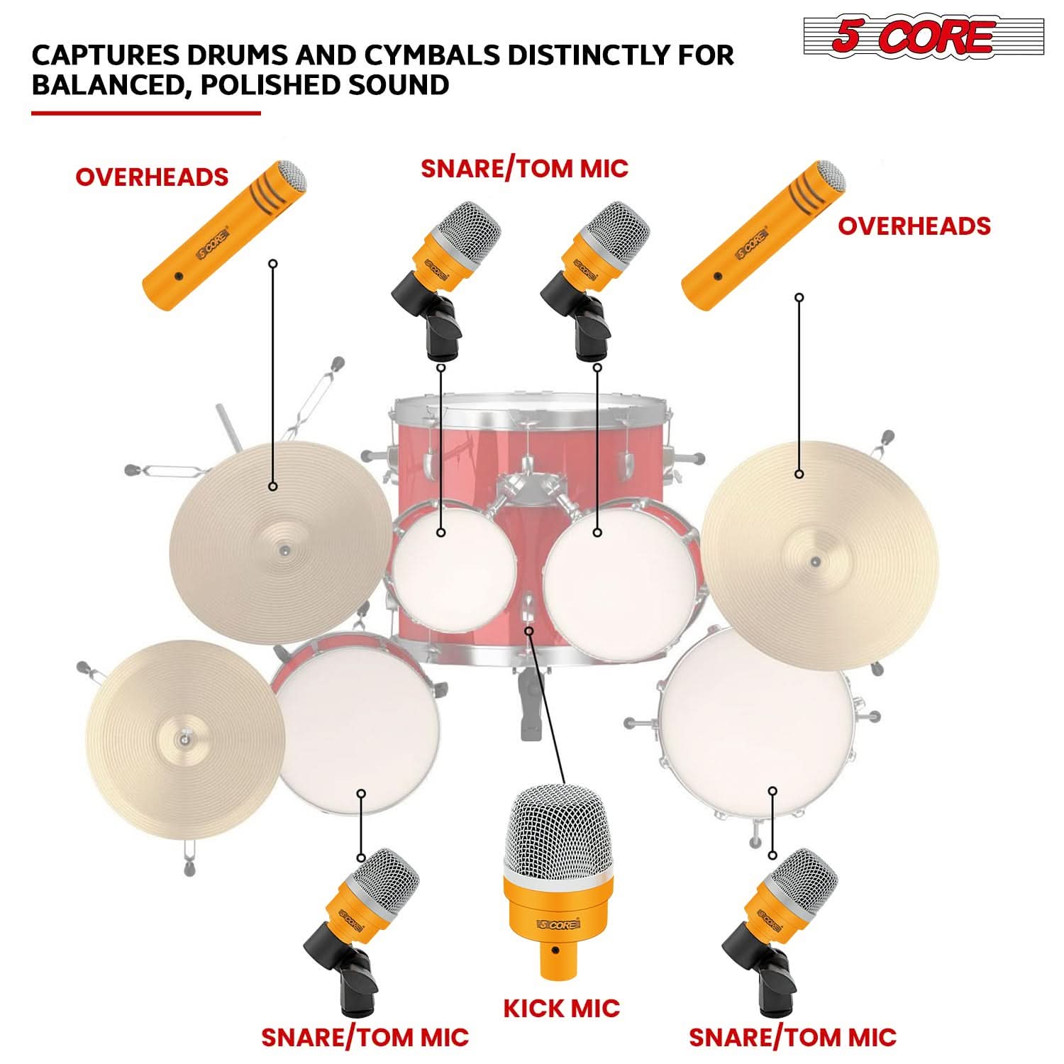 Each drum microphone is tuned to capture the unique sound of snare, toms, bass drums, and cymbals, providing a balanced and natural audio output for any 7 piece drum set |