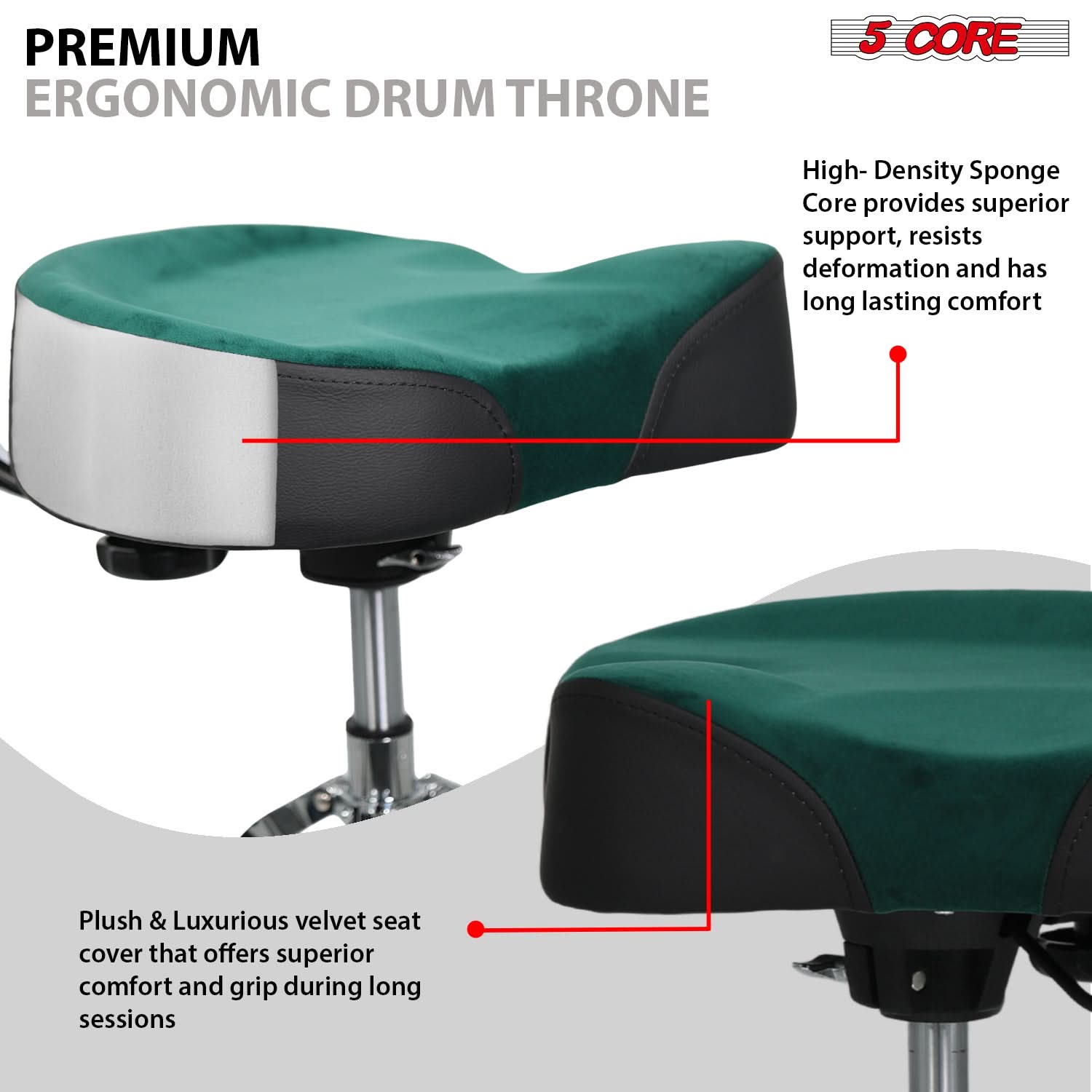 【Comfortable 4" Velvet Padded Seat】Enjoy long jam sessions with this 4-inch thick and 17 x 15.5 wide high-density foam cushion. The saddle-shaped drum throne offers excellent support, while the soft velvet seat cover adds a luxurious touch and prevents slipping even during energetic performances.