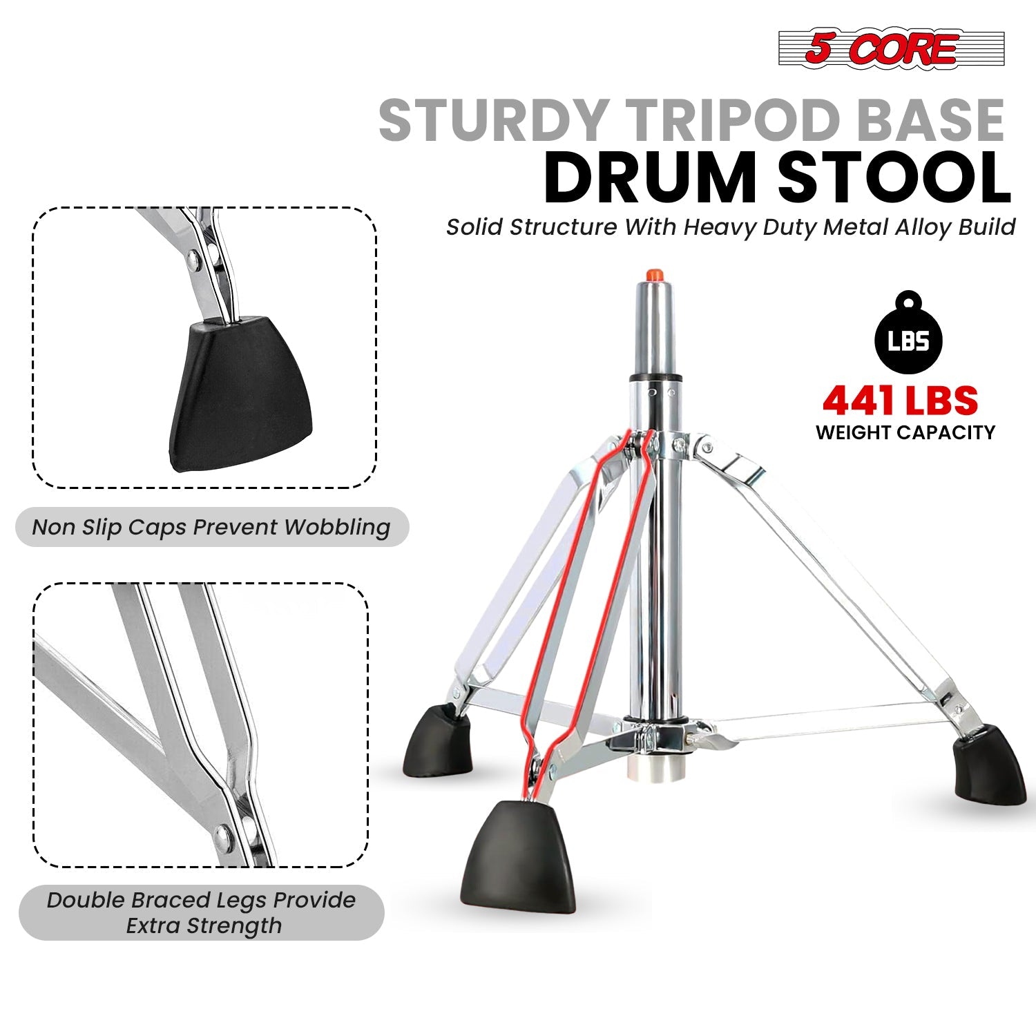 【Heavy-Duty Build & Stability】Built with robust double-braced steel legs and anti-slip rubber feet, this stool ensures excellent balance and prevents sliding during energetic performances. Supports up to 441 lbs with no wobble or tip-over risk.