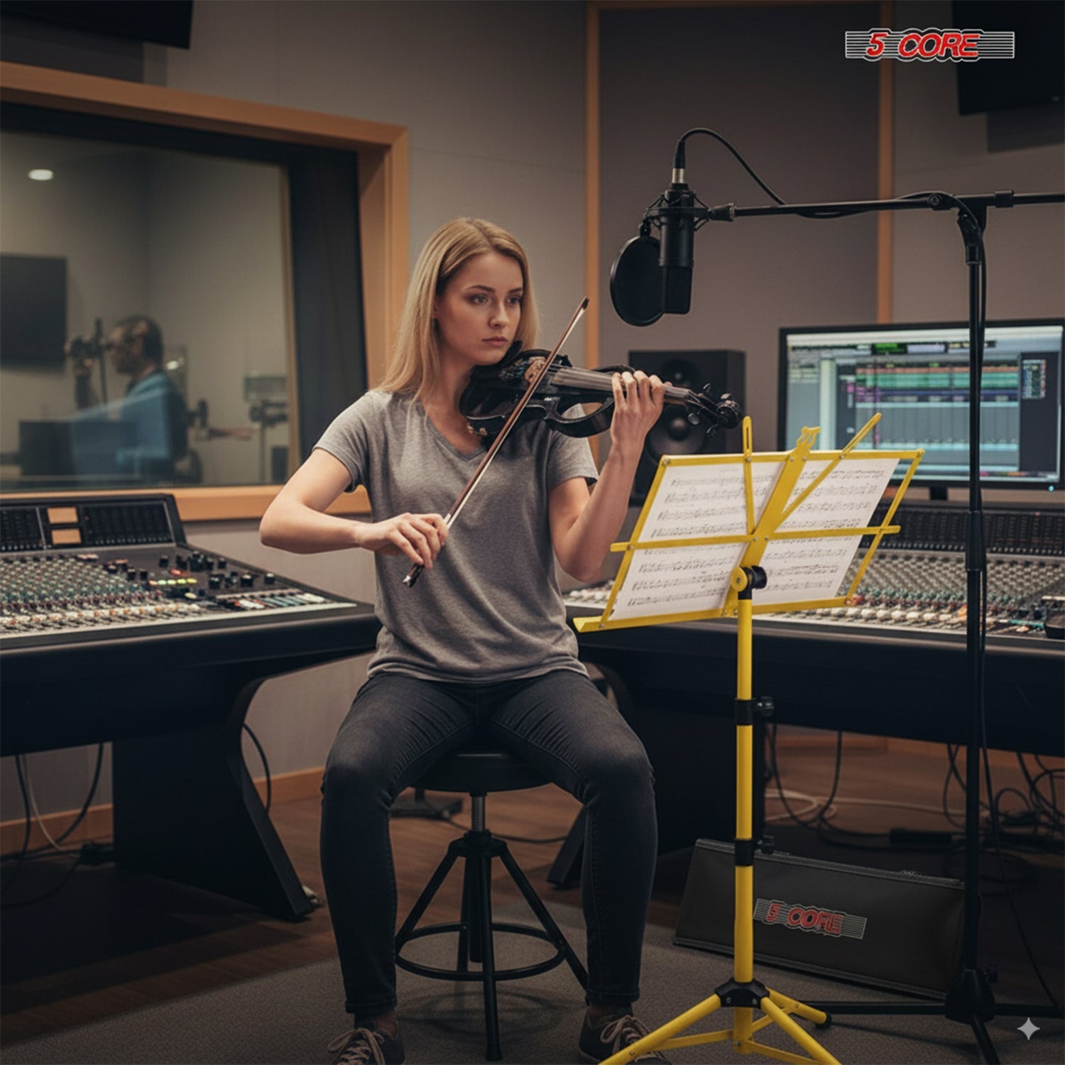 【Durable Metal Music Stand For Sheet Music Stand 】 Built with a sturdy metal frame, this foldable music stand holds up to 8 lbs with no wobble. The non-slip rubber feet keep the music stand stable on various surfaces—ideal for both indoor and outdoor use. A great choice for anyone needing a reliable music sheet stand.