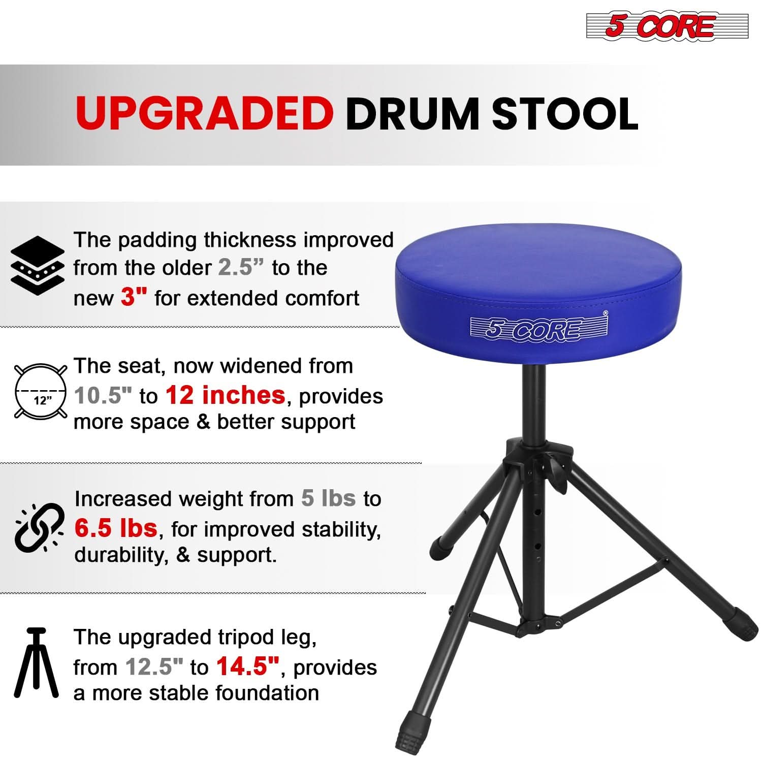 5 Core Drum Throne 3" Thick Padded Memory Foam Comfortable Drummer Stool 330Lb Capacity Adjustable