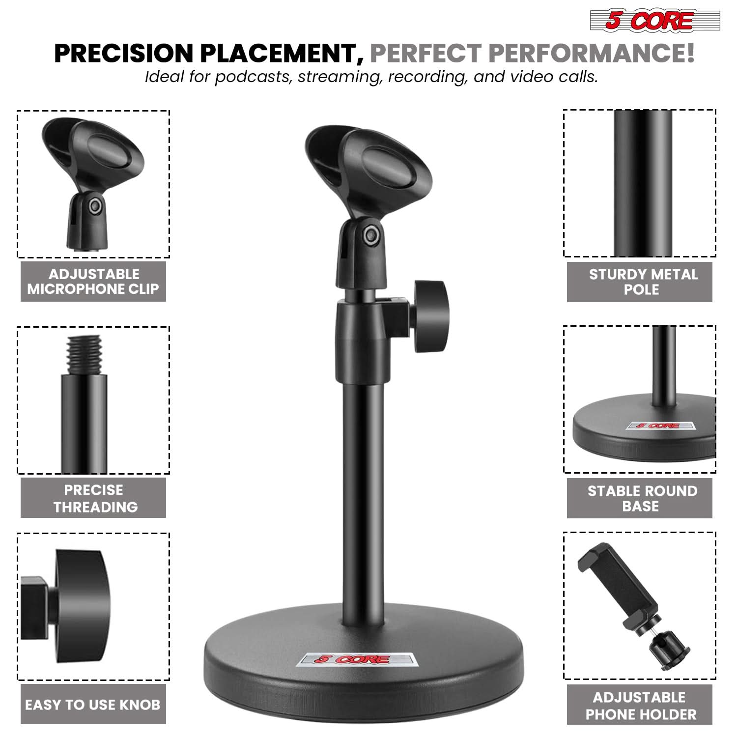 The 5 Core Desk Microphone Stand is a sturdy, adjustable, and multifunctional solution for creators, musicians, and professionals. Featuring a 5" round base, it ensures stability and prevents tipping. The metal tube construction provides durability, supporting dynamic, USB, and handheld microphones with ease. Height adjusts from 10" to 13.5", making it perfect for podcasting, recording, livestreams, and conferences. Swap clips to use it as a mic stand desk or phone holder for 2"-5" devices. Compatible with Blue Yeti, Snowball, and more. A versatile desktop microphone stand built for performance and convenience. Great value for money! |